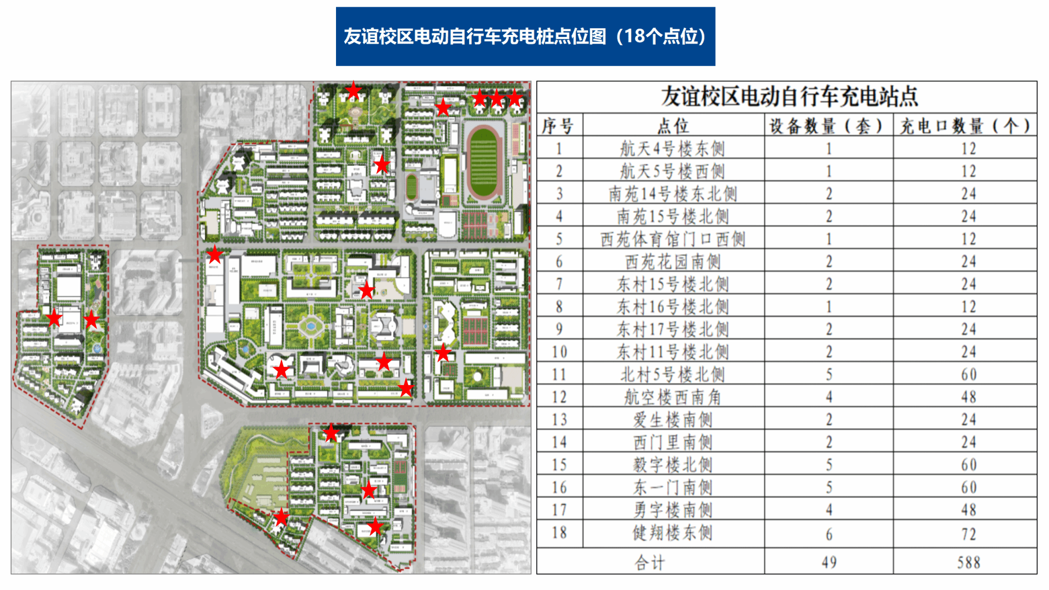 为保障正常教学及师生停车不受影响,后勤部办公室利用暑假及周末组织施工单位完成安装工作。2025年6月-11月在友谊校区公字楼北侧、航空楼A座北侧、西苑超市东侧新建新能源汽车充电桩26套,东村15号楼北侧、东村17号楼北侧、健翔楼东侧新建电动自行车充电桩10套;在长安校区海天苑大楼周边、航宇支撑学科创新中心周边新建电动自行车充电桩57套。